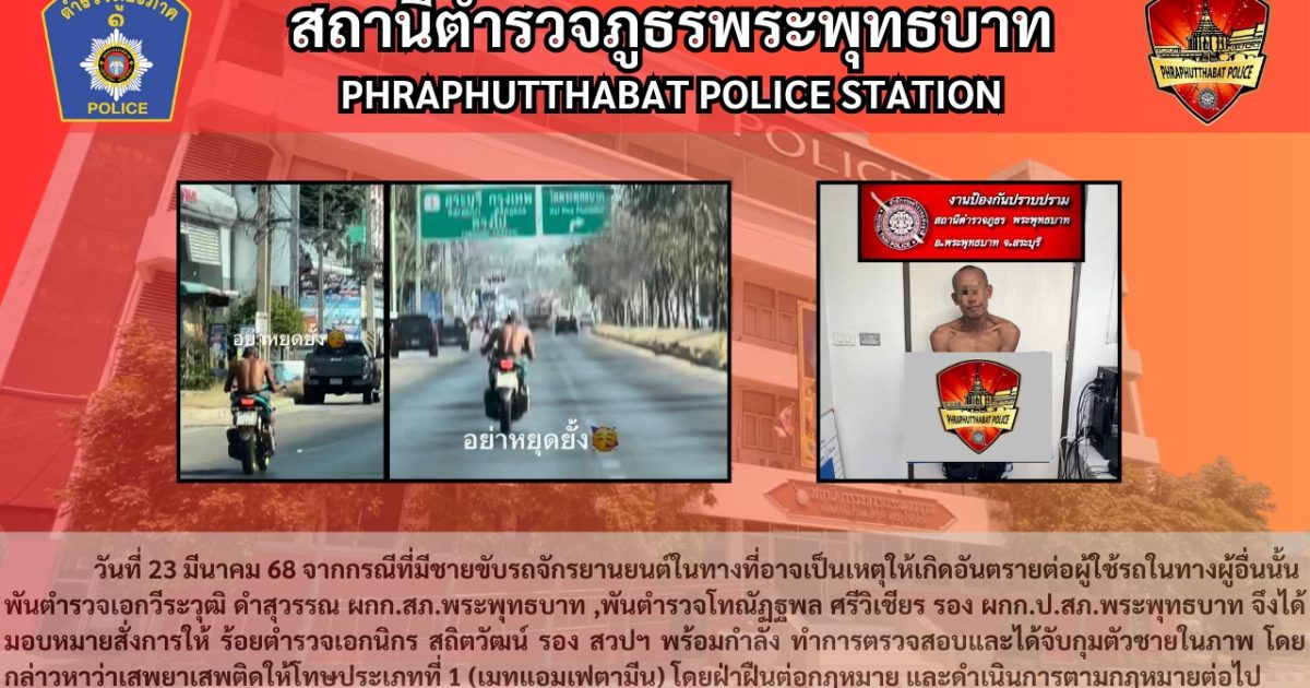 จากกรณีที่มีชายขับรถจักรยานยนต์ในทางที่อาจเป็นเหตุให้เกิดอันตรายต่อผู้ใช้รถในทางผู้อื่นนั้น วันที่ 23 มีนาคม 68  พันตำรวจเอกวีระวุฒิ ดำสุวรรณ ผกก.สภ.พระพุทธบาท ,พันตำรวจโทณัฏฐพล ศรีวิเชียร รอง ผกก.ป.สภ.พระพุทธบาท จึงได้มอบหมายสั่งการให้ ร้อยตำรวจเอกนิกร สถิตวัฒน์ รอง สวปฯ พร้อมกำลัง ทำการตรวจสอบและได้จับกุมตัวชายในภาพ โดยกล่าวหาว่าเสพยาเสพติดให้โทษประเภทที่ 1 (เมทแอมเฟตามีน) โดยฝ่าฝืนต่อกฎหมาย และดำเนินการตามกฎหมายต่อไป