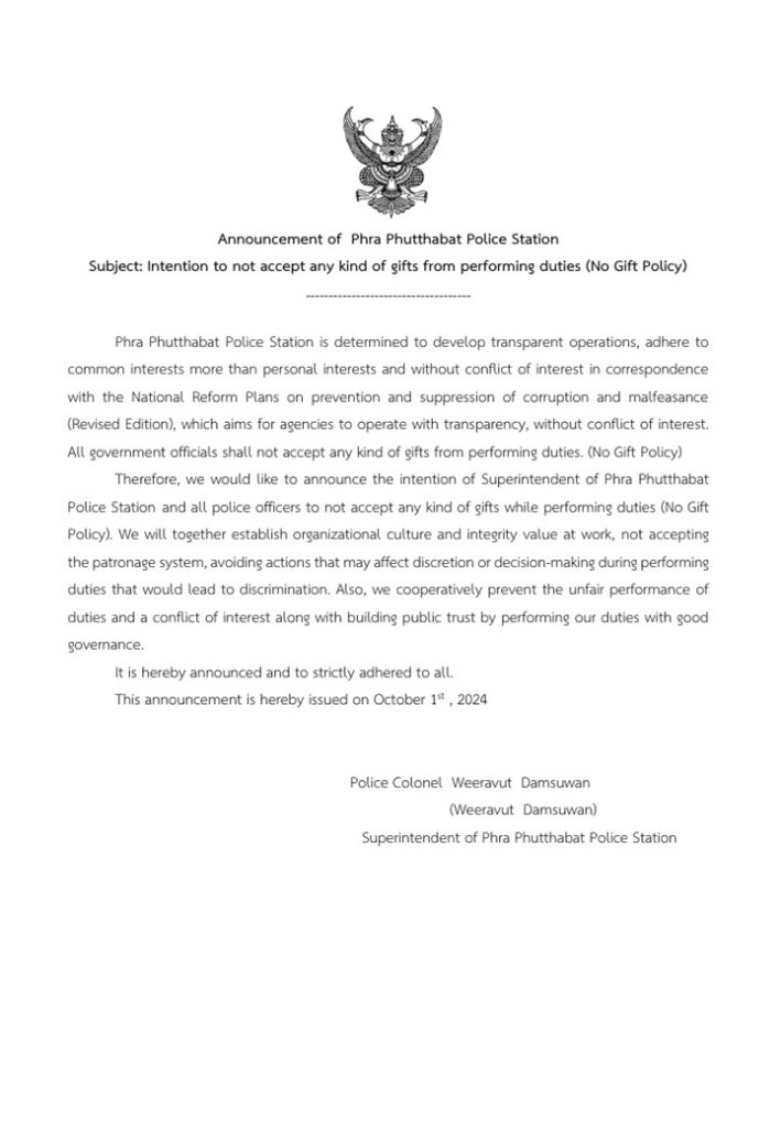 วันที่ (20 มกราคม 2567) เวลา 08.00 น. พ.ต.อ.วีระวุฒิ ดำสุวรรณ ผกก.สภ.พระพุทธบาท ประกาศเจตนารมณ์ของหน่วยงานในการต่อต้านการทุจริต / การรับสินบนยึดหลักธรรมาภิบาลในการบริหารงานและปฏิบัติหน้าที่ สร้างมาตรฐานด้านคุณธรรมและความโปร่งใส ต่อต้านการทุจริต /การรับสินบน (AnTi-Bribery Policy)และการไม่รับของขวัญของกํานัล หรือประโยชน์อื่นใด (NO Gift Policy) โดยมุ่งตอบสนองความต้องการของประชาชน ด้วยความซื่อสัตย์สุจริต เป็นธรรม โปร่งใส และสามารถตรวจสอบได้ในทุกขั้นตอนโดยมอบหมายให้เจ้าหน้าที่ตํารวจ ประชาสัมพันธ์ประกาศเจตนารมณ์ของหน่วยงานในการต่อต้านการทุจริต / การรับสินบนและประกาศเจตจํานงสุจริตในการบริหารงาน และได้มีการจัดทํา Infographic ประชาสัมพันธ์ตามจุดให้บริการประชาชน (One Stop Service) และจุดประชาสัมพันธ์ พร้อมทั้งได้ประชาสัมพันธ์ผ่านทางเวปไซต์ และเพจเฟสบุ๊ค ของสถานีตํารวจภูธรพระพุทธบาท และประชาสัมพันธ์ช่องทางการแจ้งเบาะแส ช่องทางการร้องเรียน หากพบเห็นหรือสงสัยการปฏิบัติงานของเจ้าหน้าที่ตํารวจ สามารถแจ้งข้อร้องเรียนผ่านช่องทางต่างๆ ได้ตลอด 24 ชั่วโมง