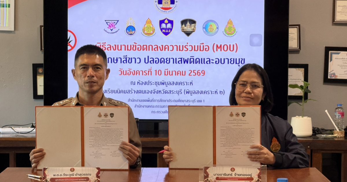 วันนี้ (10 มีนาคม 2569) พันตำรวจเอก วีระวุฒิ ดำสุวรรณ ผู้กำกับการสถานีตำรวจภูธรพระพุทธบาท เข้าร่วมพิธีลงนามบันทึกข้อตกลงความร่วมมือ (MOU) โครงการสถานศึกษาสีขาว ปลอดยาเสพติดและอบายมุข ระหว่างโรงเรียนนิคมสร้างตนเองจังหวัดสระบุรี (พิบูลสงเคราะห์ 2) กับสถานีตำรวจภูธรพระพุทธบาท การลงนามความร่วมมือในครั้งนี้มีวัตถุประสงค์เพื่อประกาศเจตนารมณ์ร่วมกันในการแก้ไขและป้องกันปัญหาการแพร่ระบาดของยาเสพติด รวมถึงพฤติกรรมเสี่ยงในสถานศึกษา อาทิ การสูบบุหรี่และบุหรี่ไฟฟ้า การบริโภคเครื่องดื่มแอลกอฮอล์ สื่อลามกอนาจาร การพนัน และการทะเลาะวิวาท ซึ่งล้วนเป็นภัยคุกคามต่อความมั่นคงและความสงบสุขของนักเรียน ทั้งนี้ความร่วมมือดังกล่าวมุ่งหวังให้เกิดผลสัมฤทธิ์อย่างเป็นรูปธรรมในการสร้างสภาพแวดล้อมทางการศึกษาที่ปลอดภัย พร้อมทั้งเสริมสร้างความเชื่อมั่นและความอุ่นใจให้แก่ผู้ปกครองและชุมชน ณ ห้องประชุมพิบูลสงเคราะห์ โรงเรียนนิคมสร้างตนเองจังหวัดสระบุรี (พิบูลสงเคราะห์ 2) อำเภอพระพุทธบาท จังหวัดสระบุรี โดยมีผู้บริหารสถานศึกษา คณะครู และเจ้าหน้าที่ตำรวจเข้าร่วมเป็นสักขีพยานในครั้งนี้