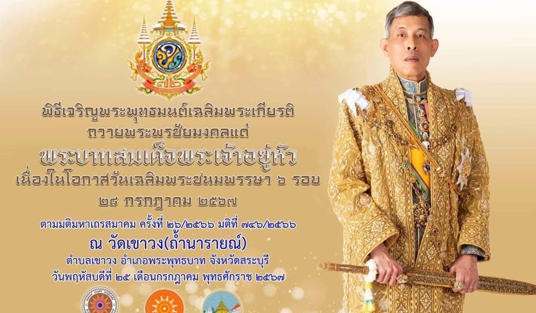 ร่วมพิธีเจริญพระพุทธมนต์ เฉลิมพระเกียรติถวายพระพรชัยมงคลแด่ พระบาทสมเด็จพระวชิรเกล้าเจ้าอยู่หัว เนื่องในโอกาสเฉลิมพระชนมพรรษา 6 รอบ 28 กรกฎาคม 2567 โดยมี นายดุรงค์ฤทธิ์ ศิริวัฒนพันธ์ รองผู้ว่าราชการจังหวัดสระบุรี เป็นประธาน พร้อมด้วยส่วนราชการเข้าร่วมพิธี ณ วัดเขาวง (ถ้ำนารายณ์) อ.พระพุทธบาท จ.สระบุรี