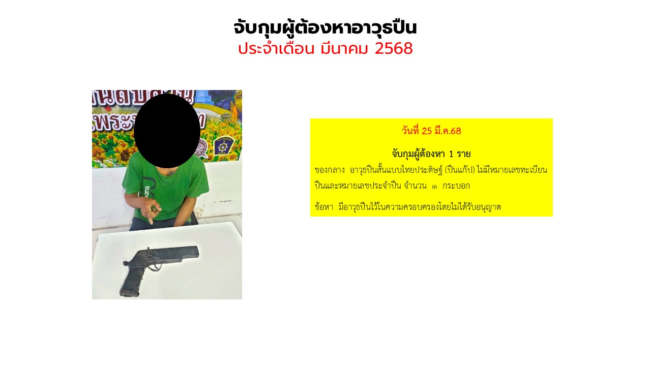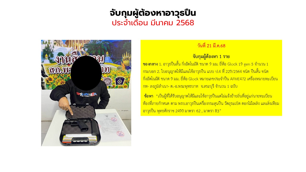 จับกุมผู้ต้องหาอาวุธปืน ประจำเดือน มีนาคม 2568